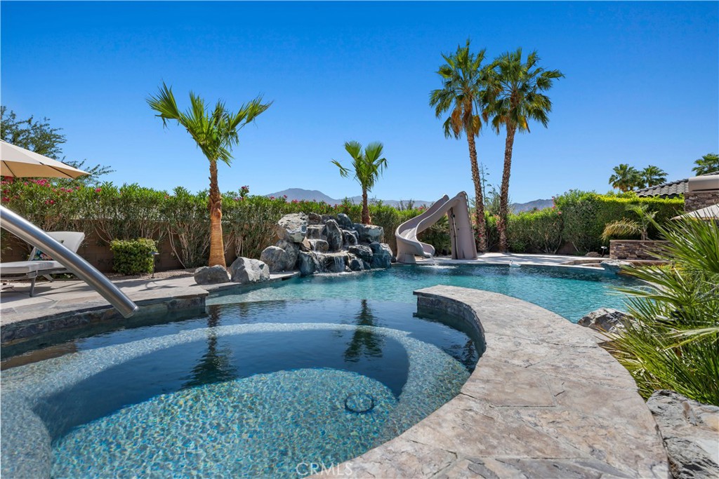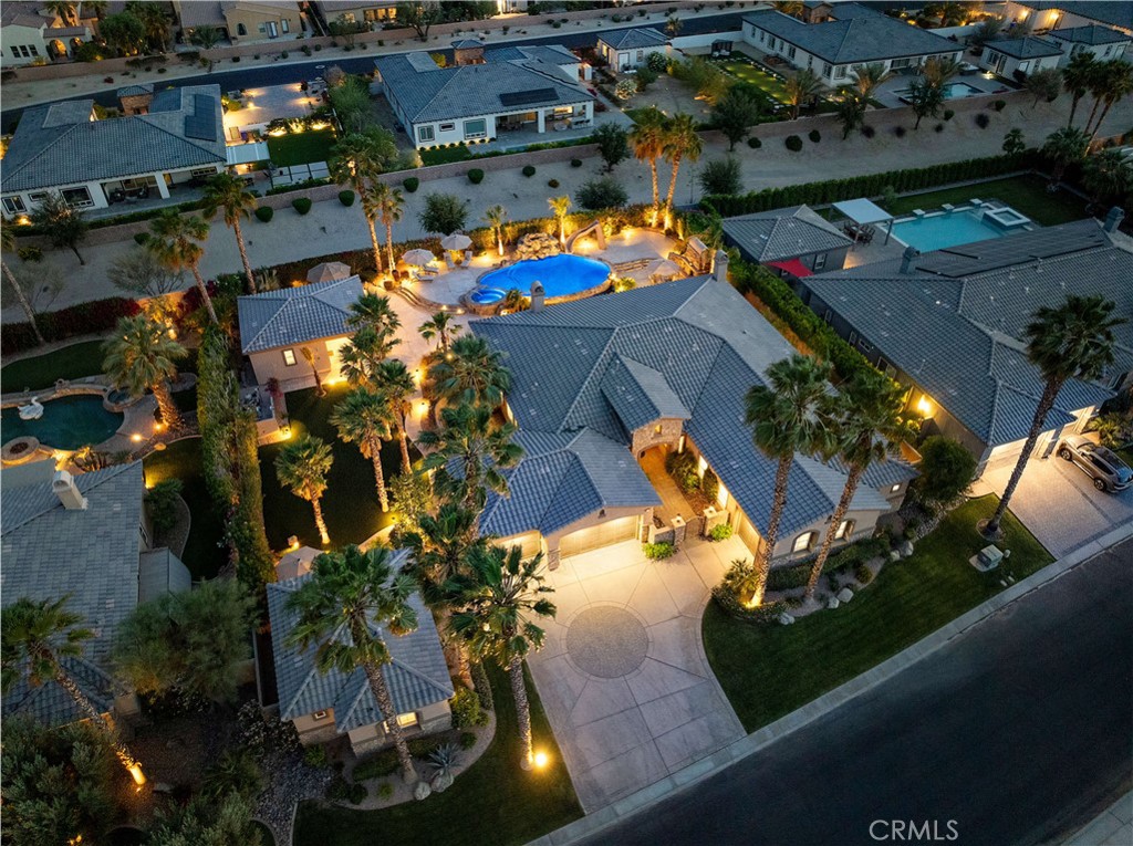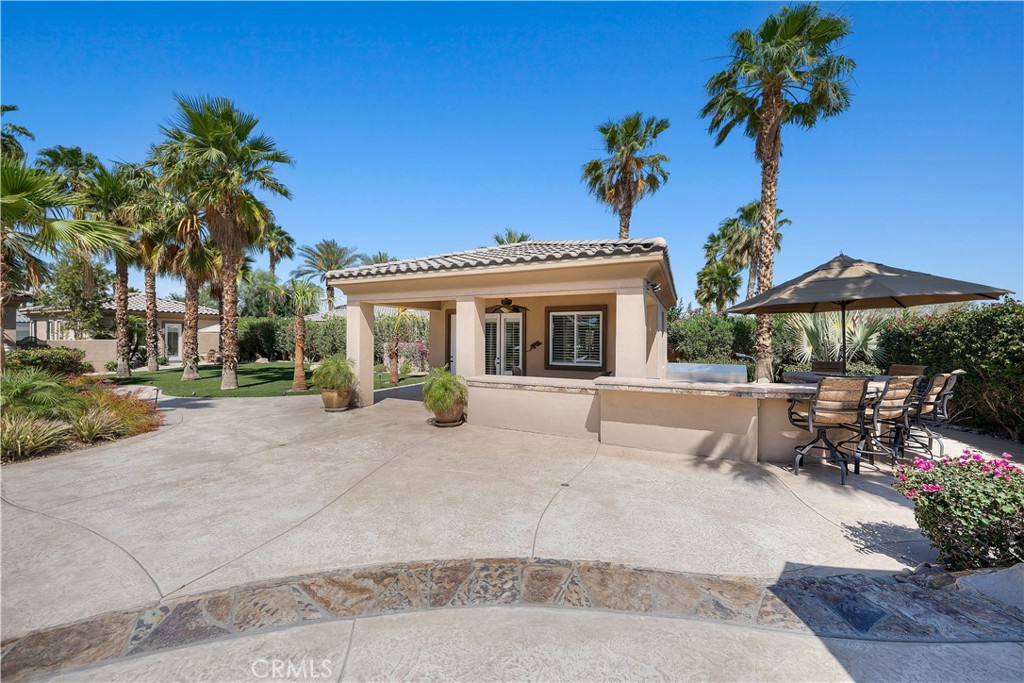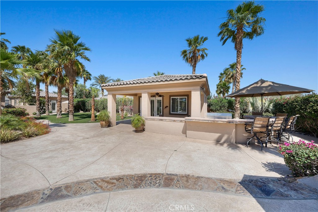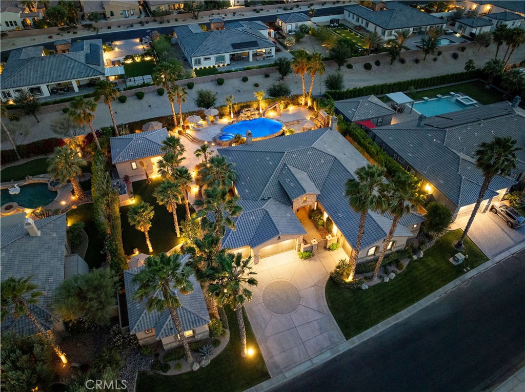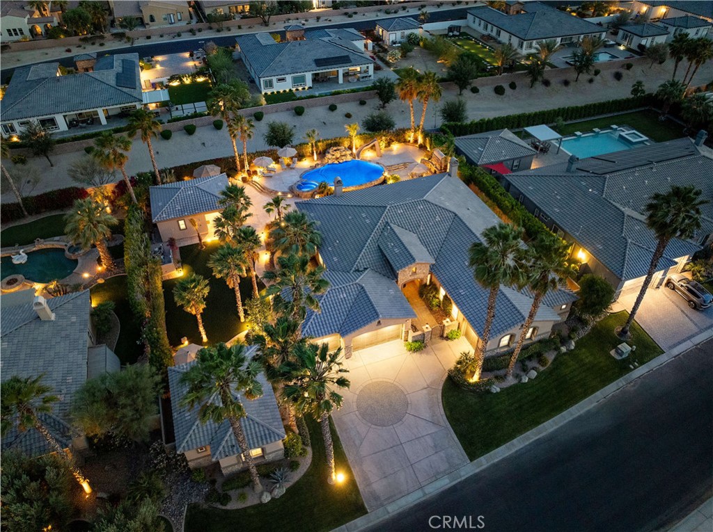 There are homes you live in, and then there are homes that change the way you live. 81893 Thoroughbred Trail is one of those rare finds, a private desert retreat that blends everyday ease with unforgettable experiences. Set against dramatic southern mountain views, the property makes a striking first impression with custom circular stonework on the driveway and gated stone entry. Imagine starting your mornings with coffee on a sunlit patio as mountain silhouettes rise in the distance. Picture weekends where friends and family gather in two private casitas, with laughter carrying from the reimagined quartzite bar to the glowing pool. At sunset, the yard becomes your own resort with BBQ sizzling, patio heaters warming the night, and sapphire reflections dancing across the water. Inside, sunlight pours through French doors into freshly painted interiors with an open layout designed for connection. The chef's kitchen inspires with premium stainless appliances, granite countertops, and stylish pendant lighting, while comfort flows throughout with new recessed lighting and refreshed ceiling fans. The primary bedroom offers a fireplace, a spa-like soaking tub, and a generous walk-in closet, creating a private retreat of its own. Outdoors, the entertainer's yard features a Pebble Tec pool, salt-chlorine system, LED lighting, built-in BBQ, heated patio with electric drop-down patio screen, misters around the patio and casita for staying cool in the heat, and lush turf framed by outdoor lighting. Additional features include two sets of washers and dryers, dual new water heaters serving both the main home and the casitas, a whole-house water filtration and softening system, a three-car attached garage, and an additional one-car attached garage. Fully furnished and turnkey, this home is designed for those who value privacy, connection, and effortless entertaining, offering a lifestyle where every day feels like a vacation.
