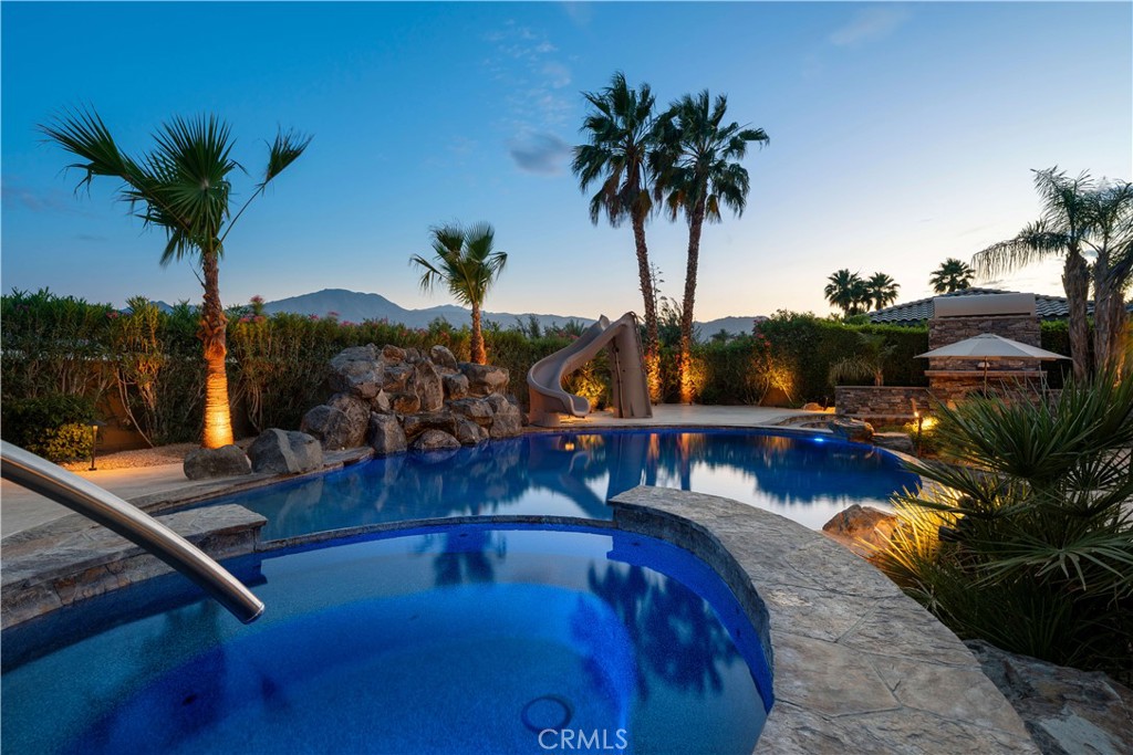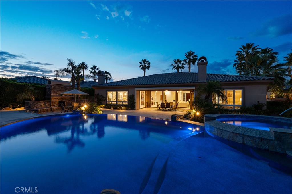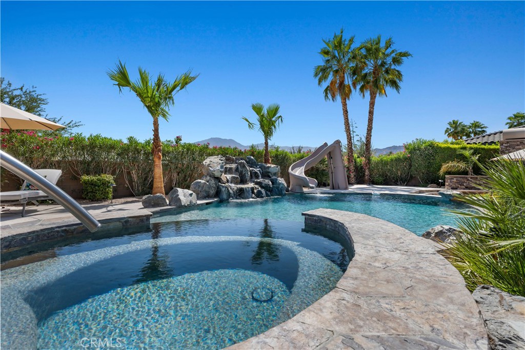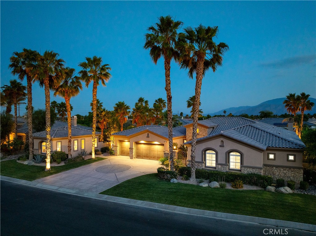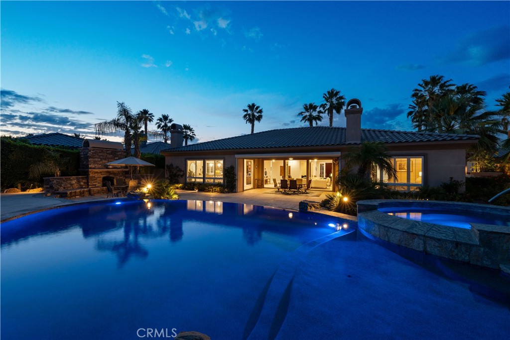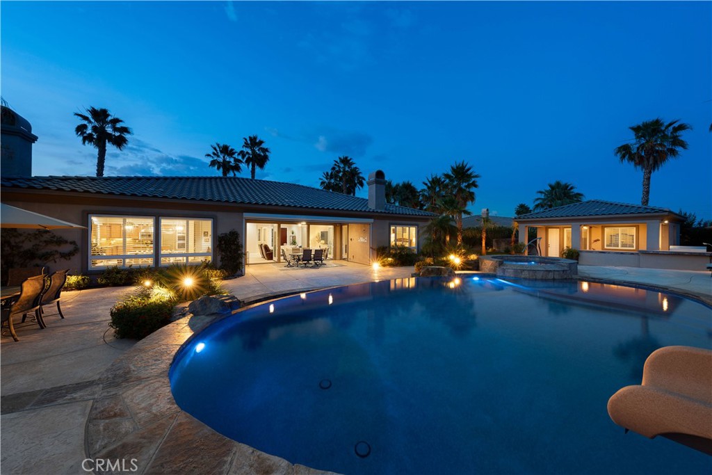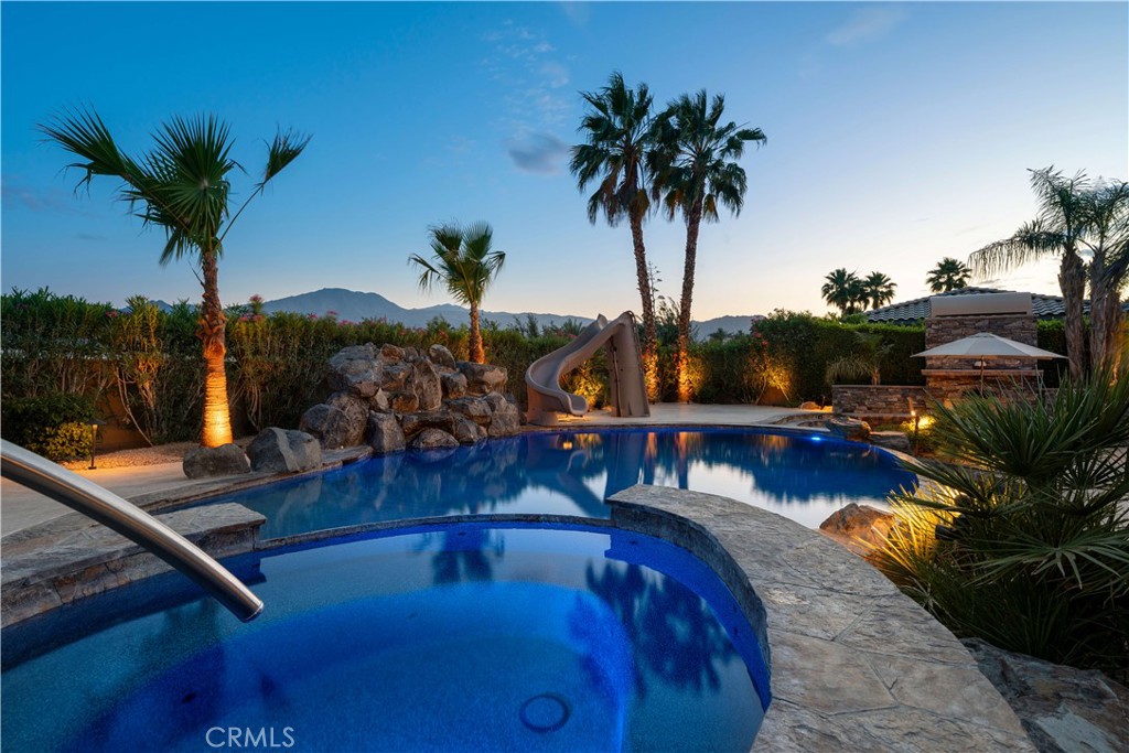 There are homes you live in, and then there are homes that change the way you live. 81893 Thoroughbred Trail is one of those rare finds, a private desert retreat that blends everyday ease with unforgettable experiences. Set against dramatic southern mountain views, the property makes a striking first impression with custom circular stonework on the driveway and gated stone entry. Imagine starting your mornings with coffee on a sunlit patio as mountain silhouettes rise in the distance. Picture weekends where friends and family gather in two private casitas, with laughter carrying from the reimagined quartzite bar to the glowing pool. At sunset, the yard becomes your own resort with BBQ sizzling, patio heaters warming the night, and sapphire reflections dancing across the water. Inside, sunlight pours through French doors into freshly painted interiors with an open layout designed for connection. The chef's kitchen inspires with premium stainless appliances, granite countertops, and stylish pendant lighting, while comfort flows throughout with new recessed lighting and refreshed ceiling fans. The primary bedroom offers a fireplace, a spa-like soaking tub, and a generous walk-in closet, creating a private retreat of its own. Outdoors, the entertainer's yard features a Pebble Tec pool, salt-chlorine system, LED lighting, built-in BBQ, heated patio with electric drop-down patio screen, misters around the patio and casita for staying cool in the heat, and lush turf framed by outdoor lighting. Additional features include two sets of washers and dryers, dual new water heaters serving both the main home and the casitas, a whole-house water filtration and softening system, a three-car attached garage, and an additional one-car attached garage. Fully furnished and turnkey, this home is designed for those who value privacy, connection, and effortless entertaining, offering a lifestyle where every day feels like a vacation.