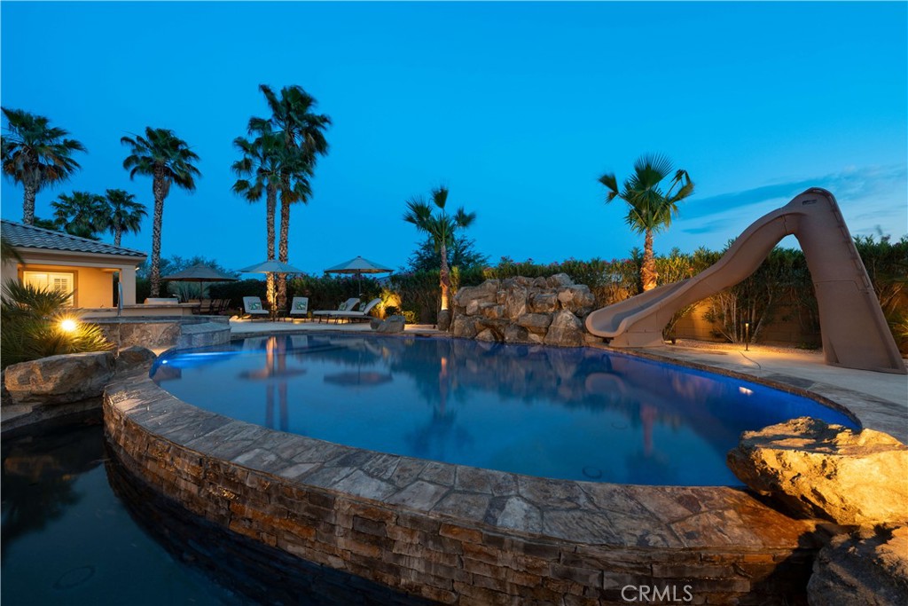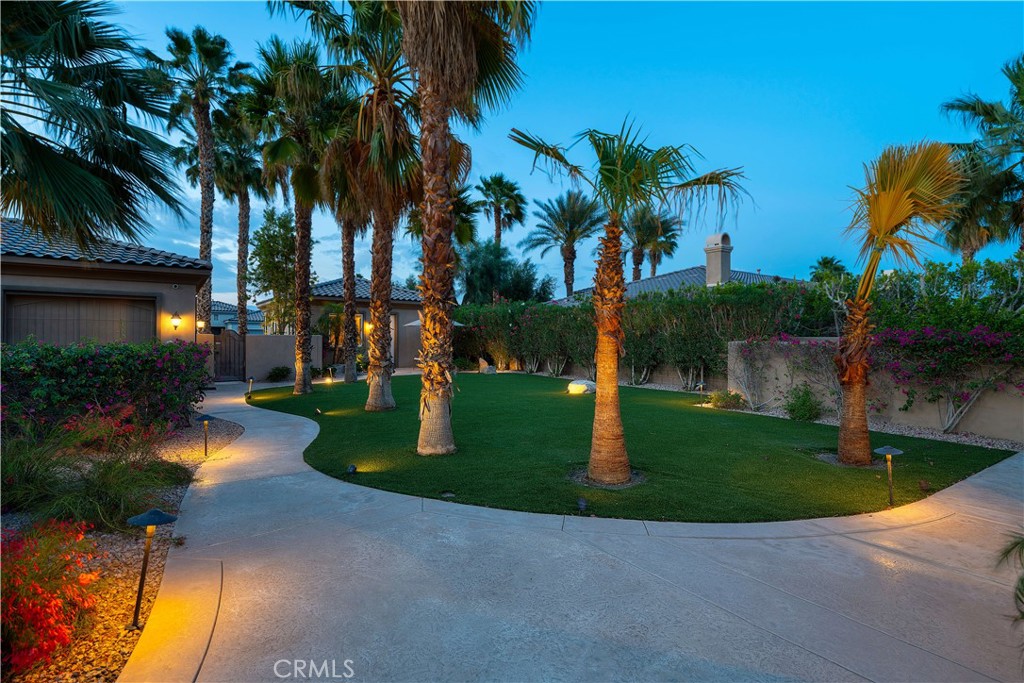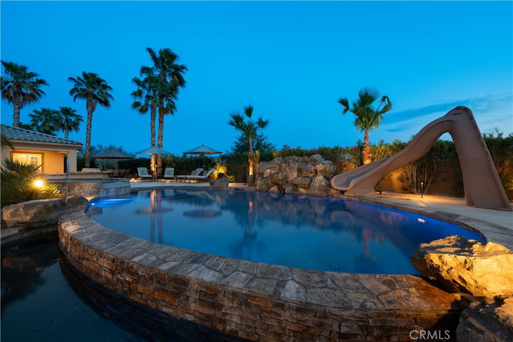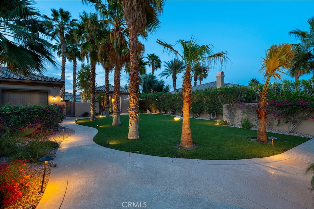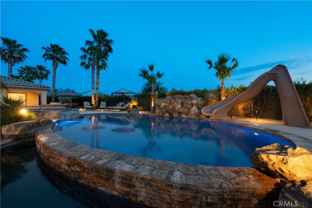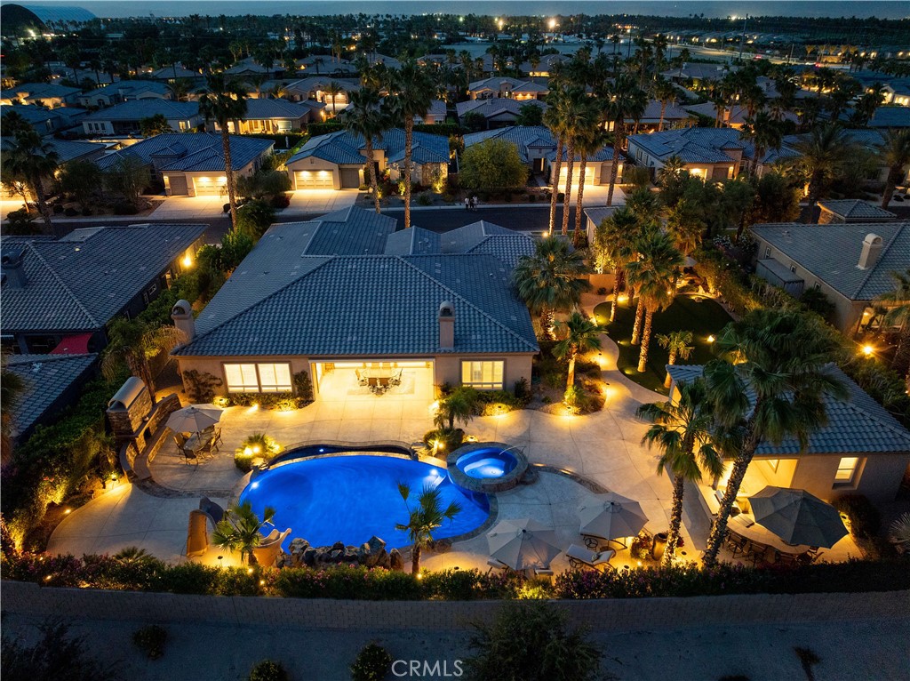 There are homes you live in, and then there are homes that change the way you live. 81893 Thoroughbred Trail is one of those rare finds, a private desert retreat that blends everyday ease with unforgettable experiences. Set against dramatic southern mountain views, the property makes a striking first impression with custom circular stonework on the driveway and gated stone entry. Imagine starting your mornings with coffee on a sunlit patio as mountain silhouettes rise in the distance. Picture weekends where friends and family gather in two private casitas, with laughter carrying from the reimagined quartzite bar to the glowing pool. At sunset, the yard becomes your own resort with BBQ sizzling, patio heaters warming the night, and sapphire reflections dancing across the water. Inside, sunlight pours through French doors into freshly painted interiors with an open layout designed for connection. The chef's kitchen inspires with premium stainless appliances, granite countertops, and stylish pendant lighting, while comfort flows throughout with new recessed lighting and refreshed ceiling fans. The primary bedroom offers a fireplace, a spa-like soaking tub, and a generous walk-in closet, creating a private retreat of its own. Outdoors, the entertainer's yard features a Pebble Tec pool, salt-chlorine system, LED lighting, built-in BBQ, heated patio with electric drop-down patio screen, misters around the patio and casita for staying cool in the heat, and lush turf framed by outdoor lighting. Additional features include two sets of washers and dryers, dual new water heaters serving both the main home and the casitas, a whole-house water filtration and softening system, a three-car attached garage, and an additional one-car attached garage. Fully furnished and turnkey, this home is designed for those who value privacy, connection, and effortless entertaining, offering a lifestyle where every day feels like a vacation.