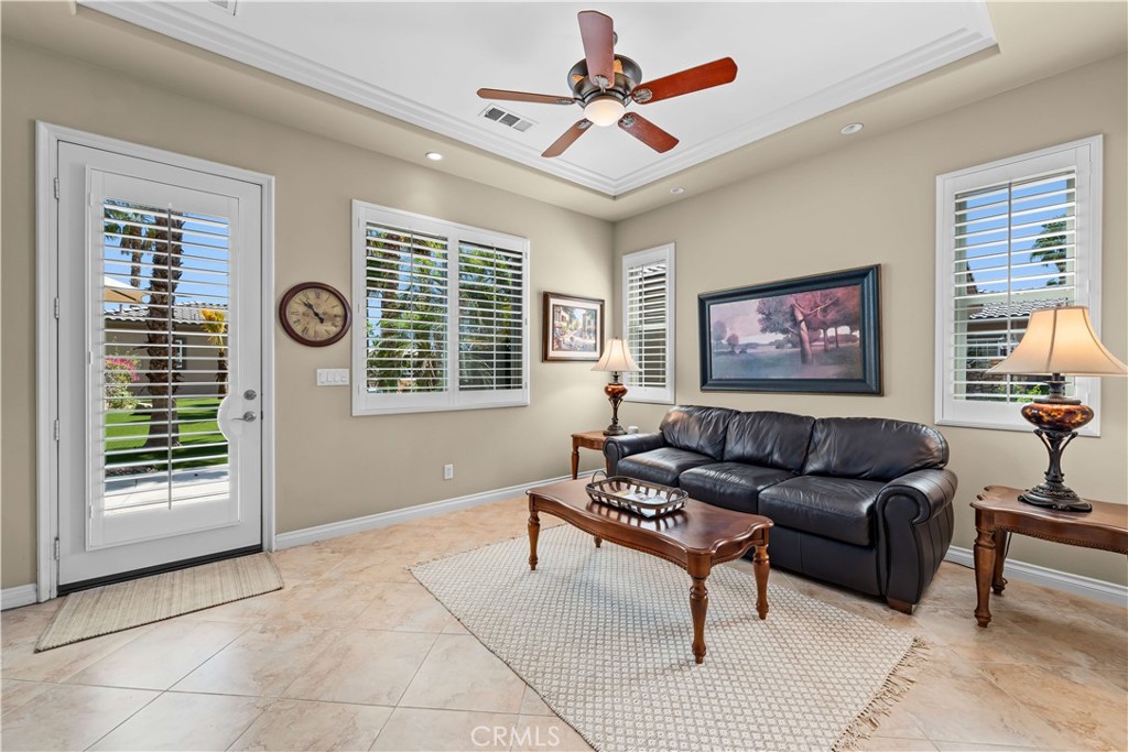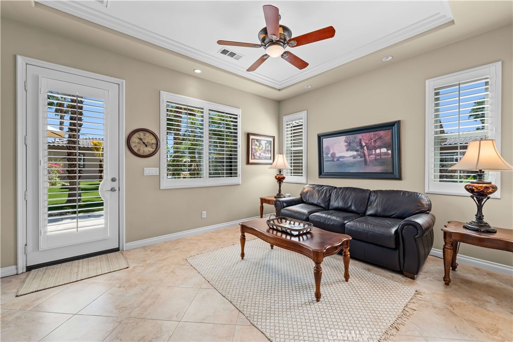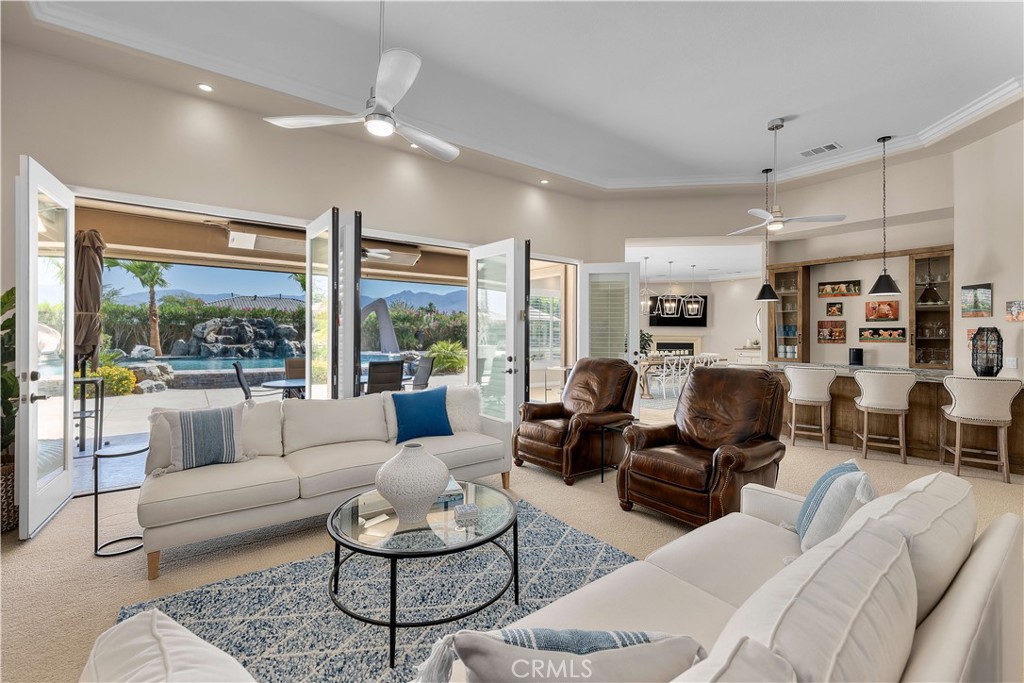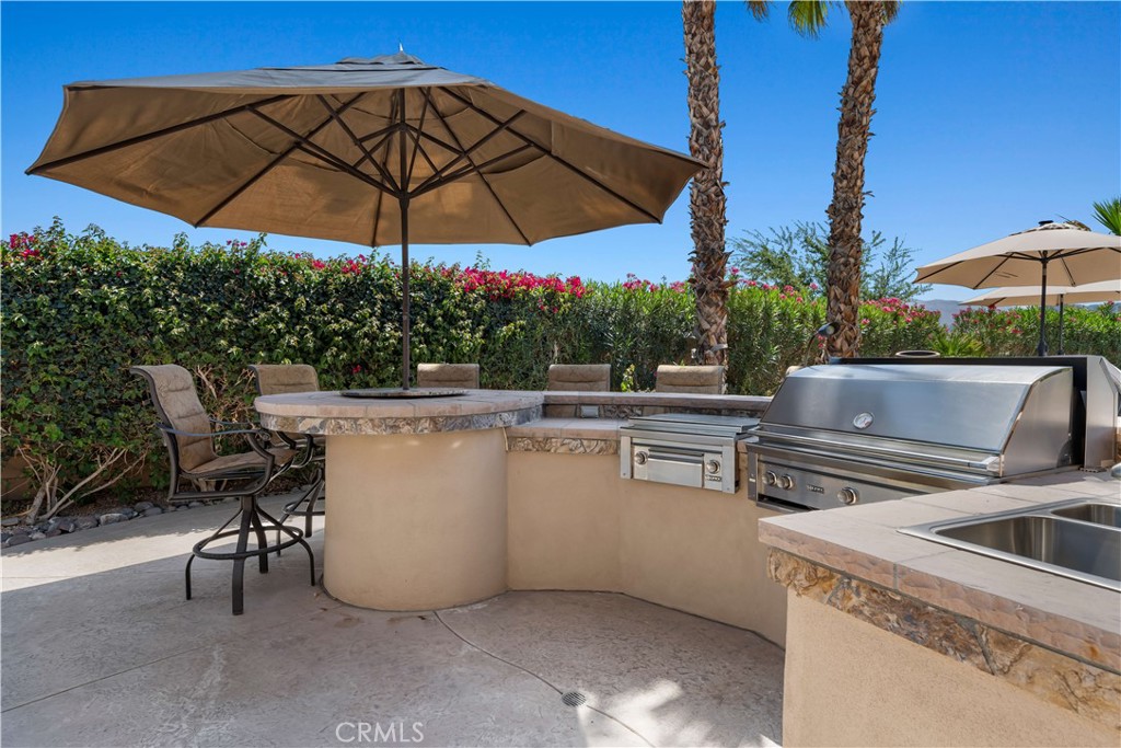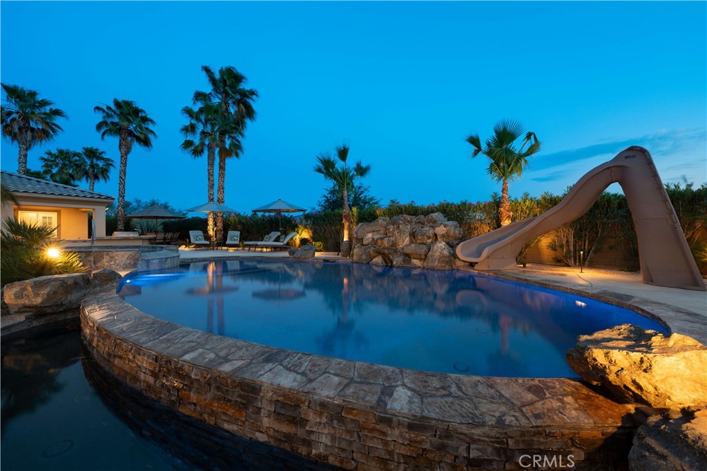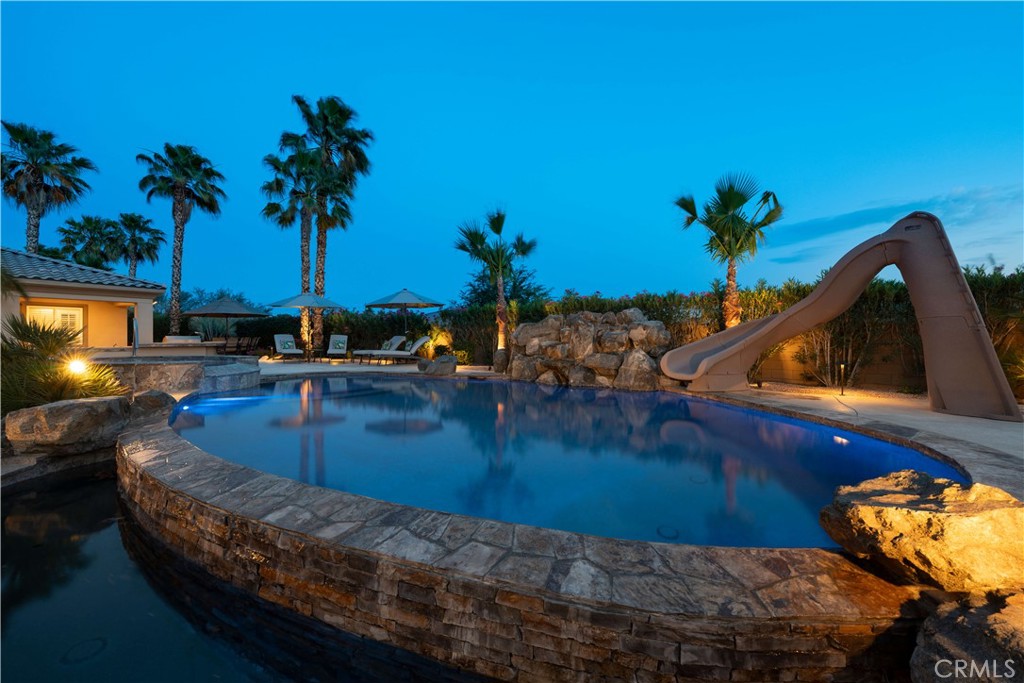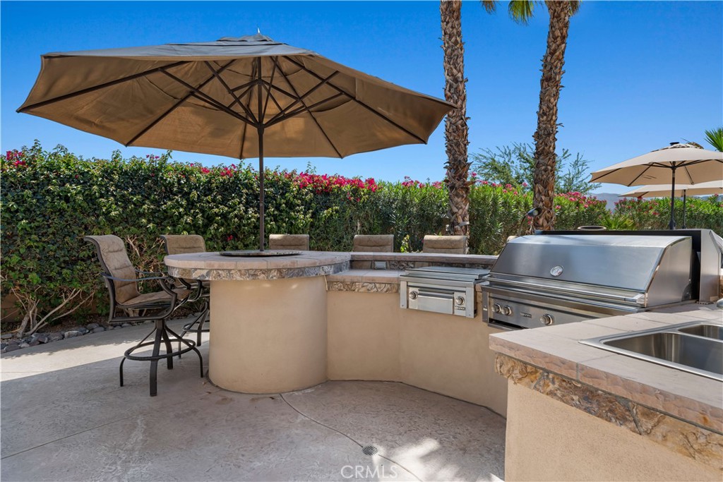 There are homes you live in, and then there are homes that change the way you live. 81893 Thoroughbred Trail is one of those rare finds, a private desert retreat that blends everyday ease with unforgettable experiences. Set against dramatic southern mountain views, the property makes a striking first impression with custom circular stonework on the driveway and gated stone entry. Imagine starting your mornings with coffee on a sunlit patio as mountain silhouettes rise in the distance. Picture weekends where friends and family gather in two private casitas, with laughter carrying from the reimagined quartzite bar to the glowing pool. At sunset, the yard becomes your own resort with BBQ sizzling, patio heaters warming the night, and sapphire reflections dancing across the water. Inside, sunlight pours through French doors into freshly painted interiors with an open layout designed for connection. The chef's kitchen inspires with premium stainless appliances, granite countertops, and stylish pendant lighting, while comfort flows throughout with new recessed lighting and refreshed ceiling fans. The primary bedroom offers a fireplace, a spa-like soaking tub, and a generous walk-in closet, creating a private retreat of its own. Outdoors, the entertainer's yard features a Pebble Tec pool, salt-chlorine system, LED lighting, built-in BBQ, heated patio with electric drop-down patio screen, misters around the patio and casita for staying cool in the heat, and lush turf framed by outdoor lighting. Additional features include two sets of washers and dryers, dual new water heaters serving both the main home and the casitas, a whole-house water filtration and softening system, a three-car attached garage, and an additional one-car attached garage. Fully furnished and turnkey, this home is designed for those who value privacy, connection, and effortless entertaining, offering a lifestyle where every day feels like a vacation.